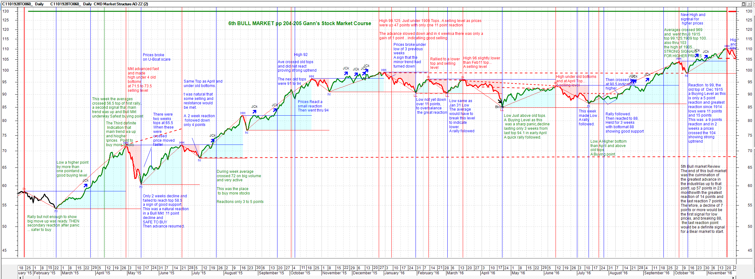 For this approach, I adapted a Slightly more flexible Market Structure indicator ( then previous market structure post) and applied it to the DJIA data which Gann commented on in case studies of a Bull and Bear Market campaign from 1915 to 1918 in his stock market course. I recall he did a similar case study covering later DJIA years in his book 45 Years In Wall Street. Reading the charts below, the comments relate to the point in time with a vertical line to the left of the comment. Some comments in green seem to be more general comments but they as typed exactly per the course albeit shortened comments in some instances.